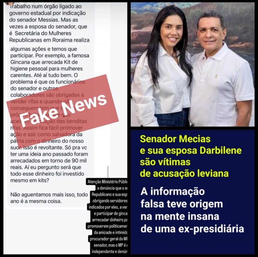 Uma publicação espalhada em grupos de notícias por whatsapp em Roraima, repercurtiu no sábado, dia 22, nem tanto pela credibilidade da autora da mentira, até porque a mesma não tem credibilidade, mas chamou atenção porque envolve o nome do senador Mecias de Jesus (Republicanos/RR) e sua esposa, Darbilene, conhecida por Darbi e está a frente do Republicanos Mulher em Roraima.